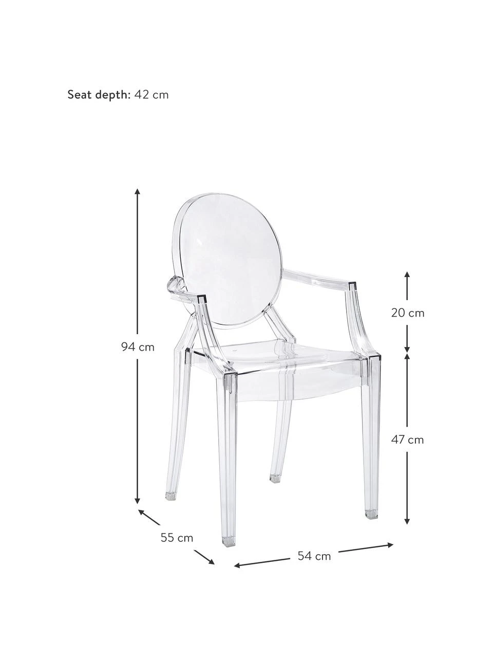 Kartell Transparenter Armlehnstuhl Louis Ghost, B 54 x T 55 cm